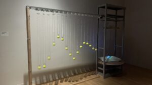 16個のテニスボールが波形を描いている作品で、説明キャプションがなかったため自分なりの解釈ですが、